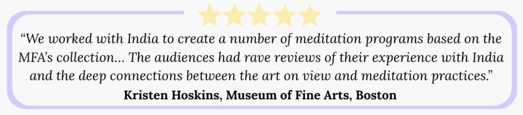 We partner with museums, universities, and wellness organizations to offer public and private workshops, guided meditations, staff retreats, and recordings that align with your community, your audience, your collection.